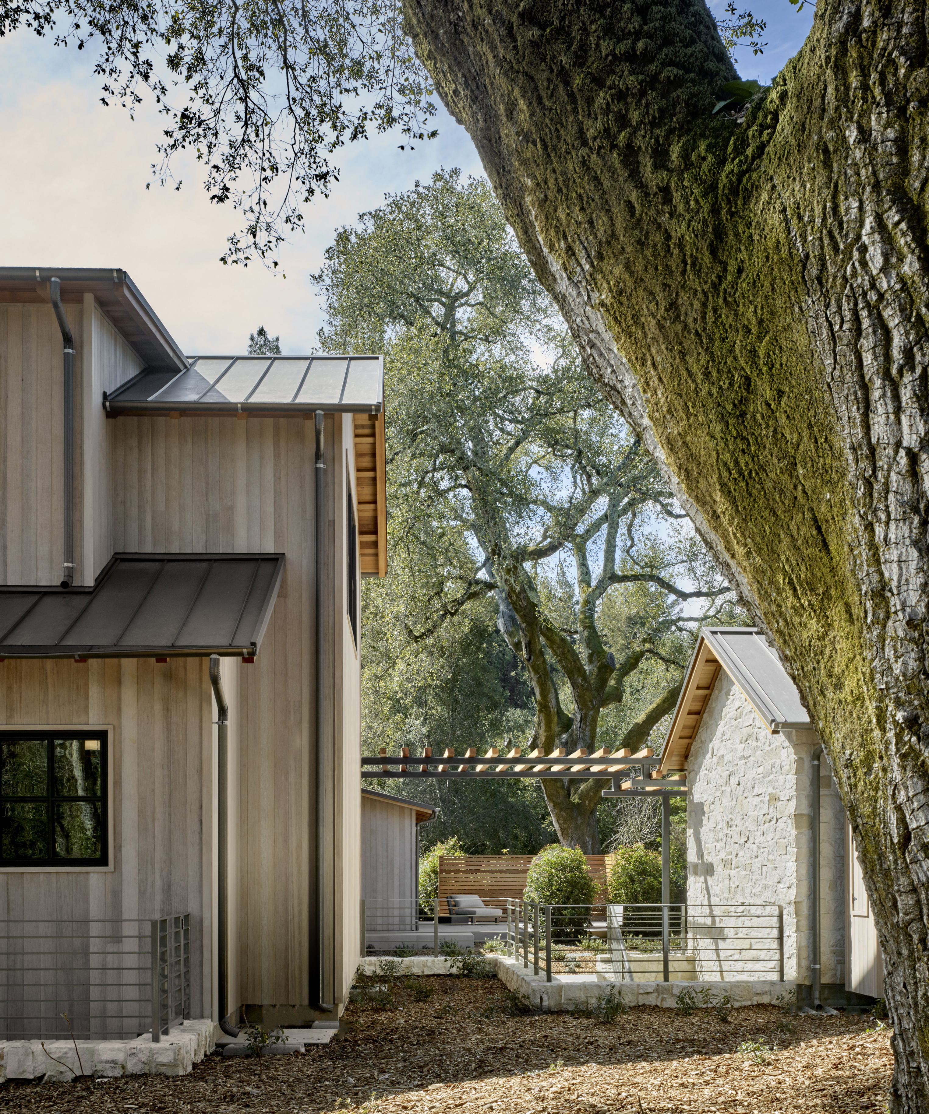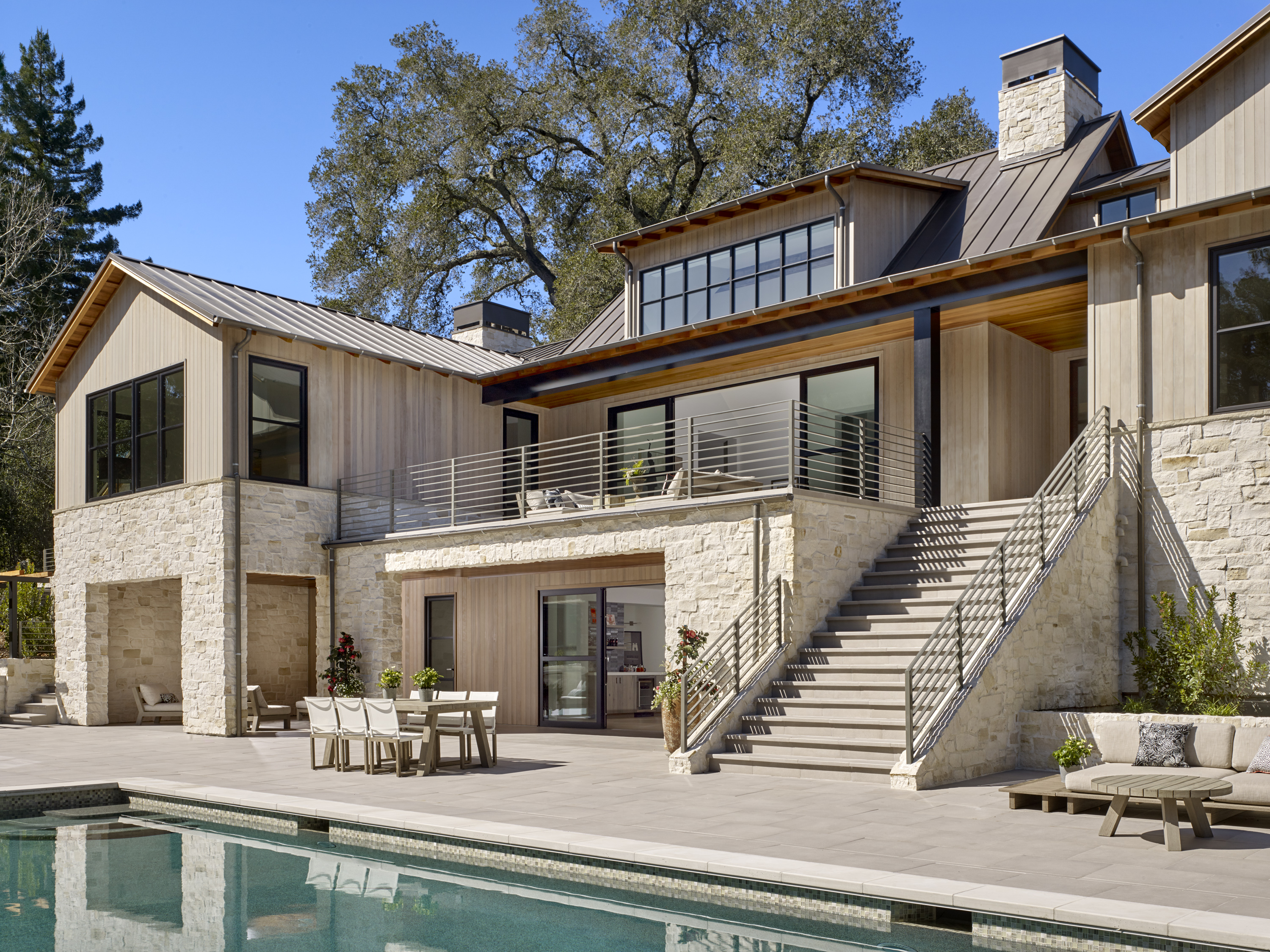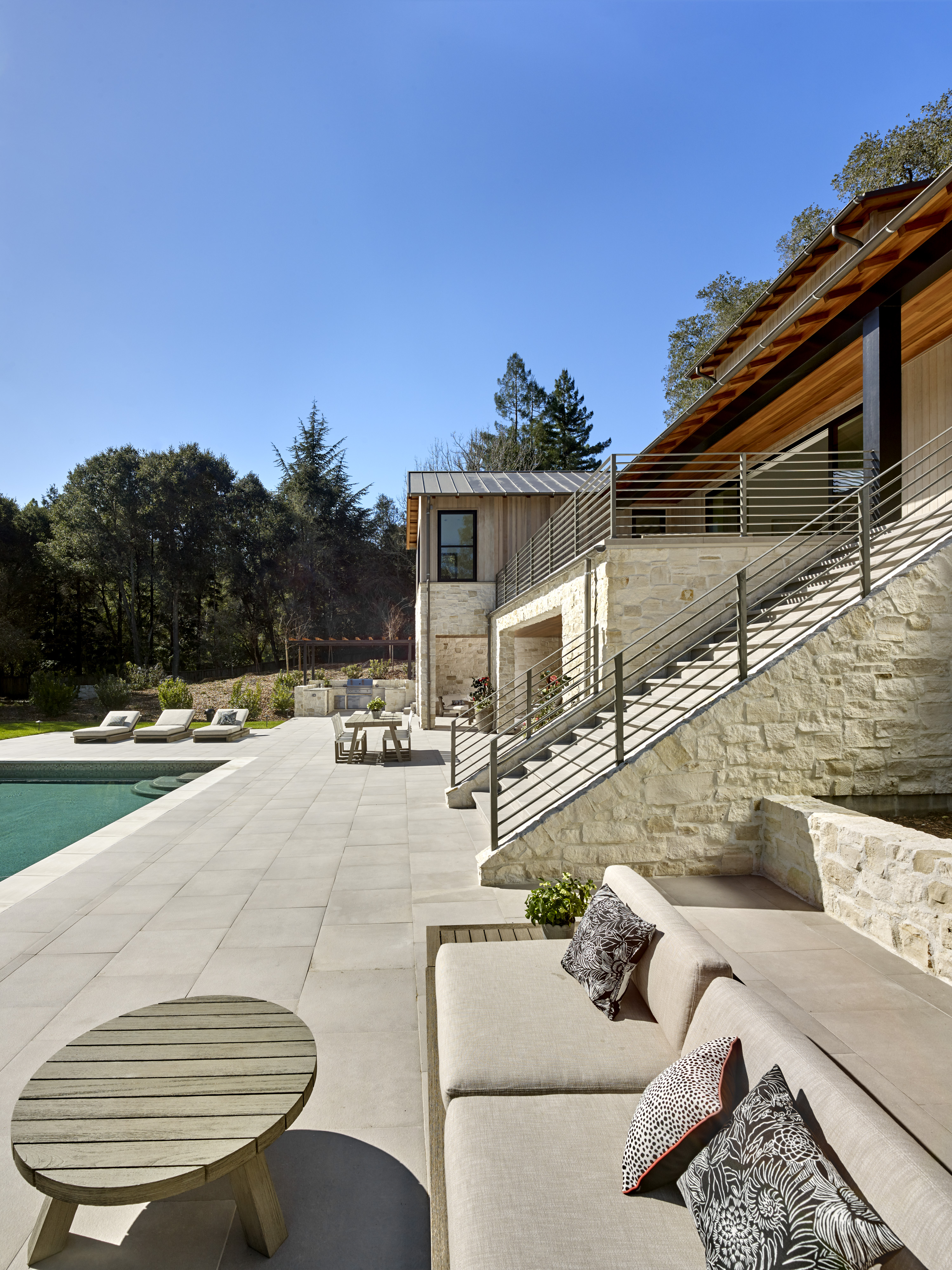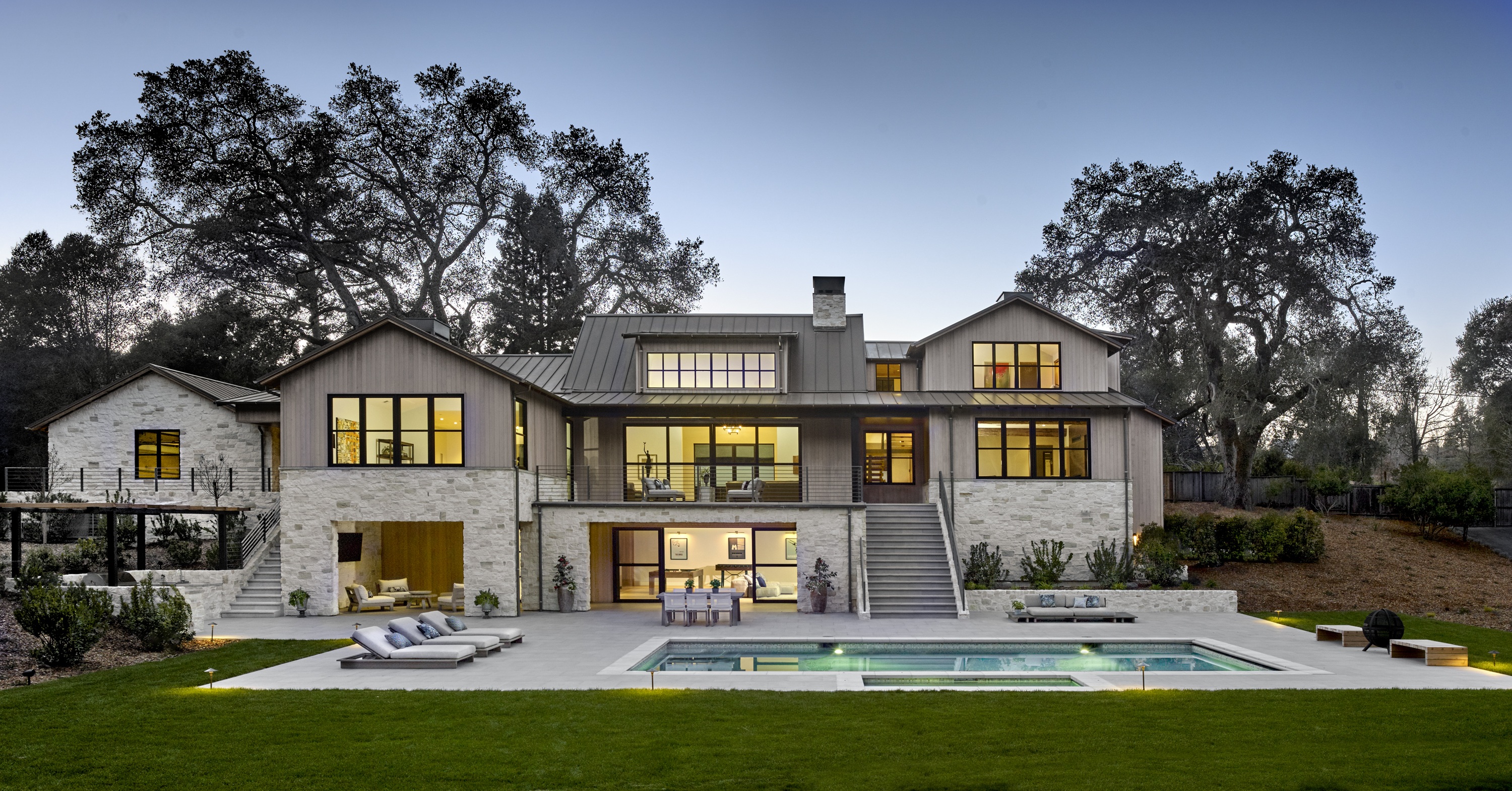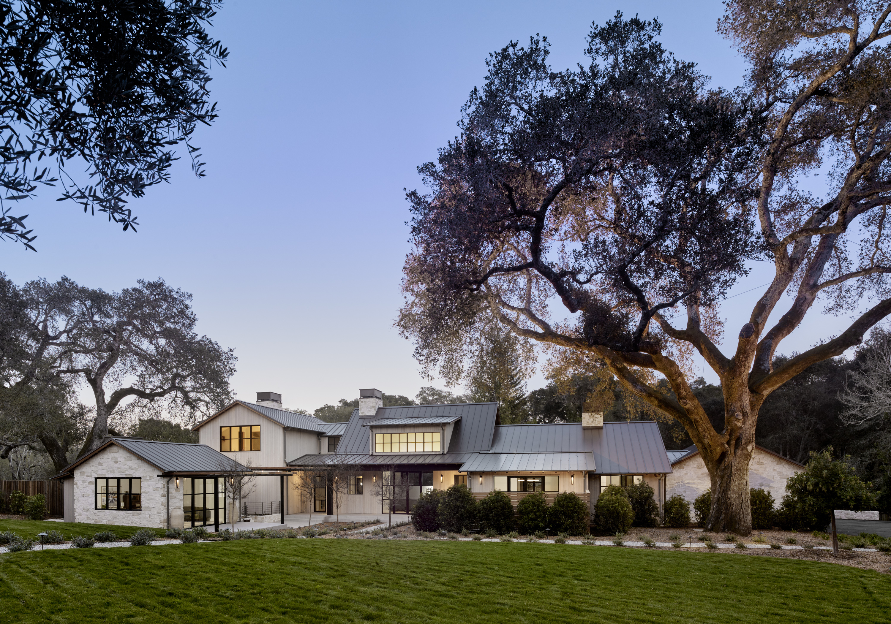 New ~9,500 sf two story residence with a basement, new detached garage, remodeled guesthouse and barn, and overall site design located in Woodside, CA completed in 2017.